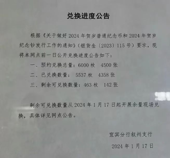 提醒!这次龙钞龙币余量少,各省市区可能都是采用线下现场兑换,先到先得形式,具体看央行公告。而现场兑换的网点基本上是线上可预约兑换的网点,但这些网点不一定还有余量可兑换,所以一定要看线下兑换告示。按“正规程序”来说这些可兑换网点会贴出公告,如果没有贴出,最好要问清楚一下银行网点。如果盲目去排队兑换,那就有可能错过了赚钱机会,而且还白熬一个晚上,那真是跟着龙钞疯了。