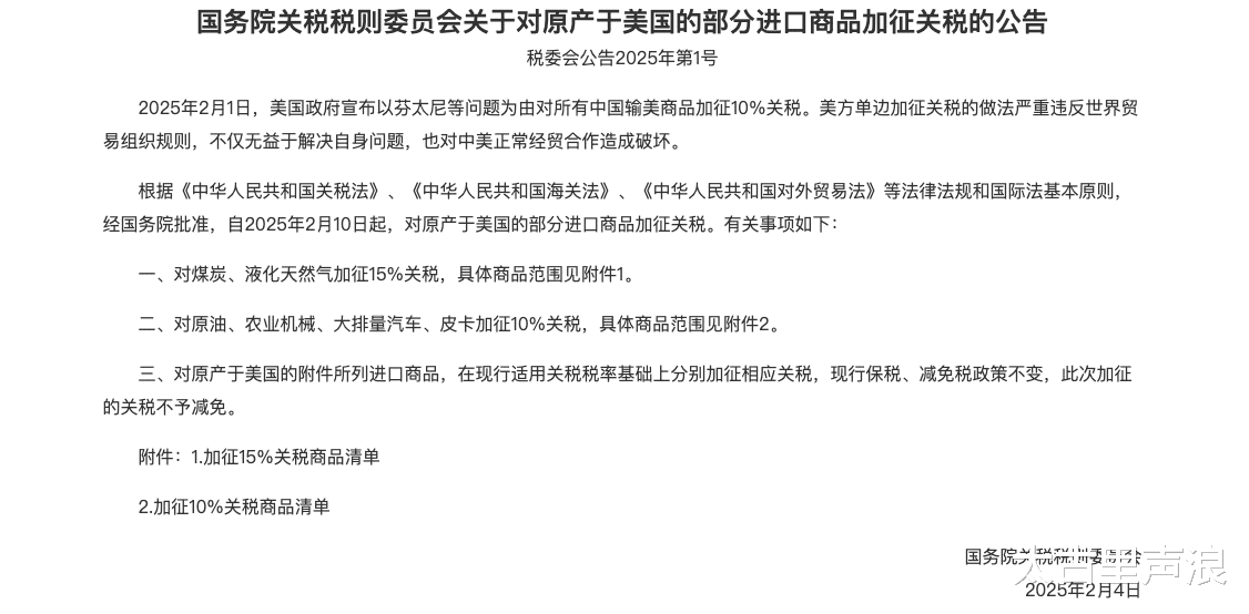 2月4日,国务院关税税则委员会发出了一则公告,其内容是对原产于美国的部分进口商品加征关税。也就是说,从2025年2月10日起,中国对原产于美国的原油、农业机械、大排量汽车、皮卡加征10%关税。