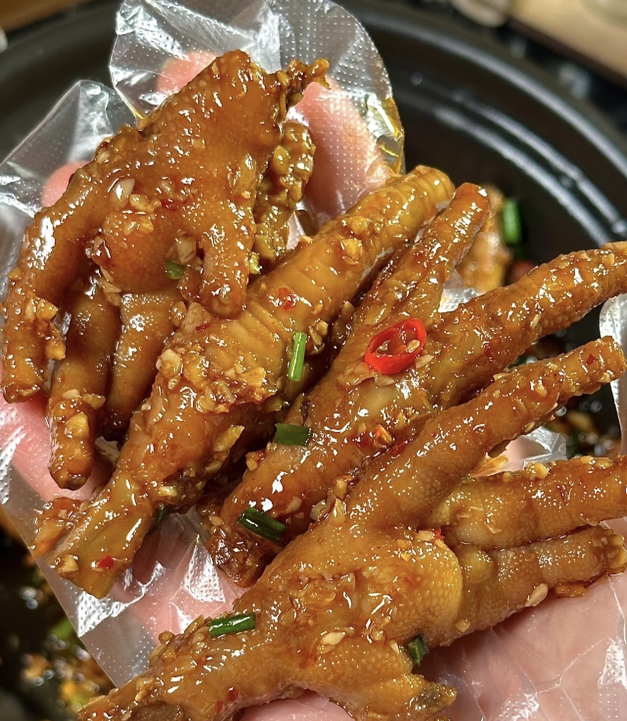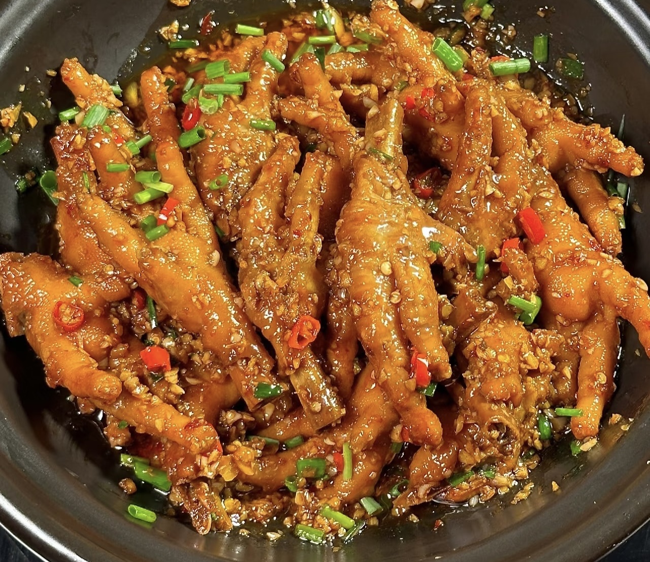 1.将冰水中凉透的鸡爪捞出,沥干水分,放入调配好的蒜蓉酱汁中;