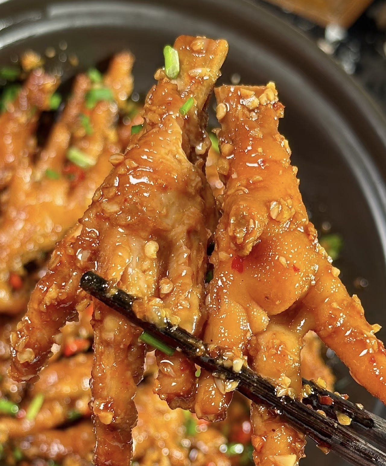 2.用筷子轻轻翻动鸡爪,确保每只鸡爪都裹上酱汁;