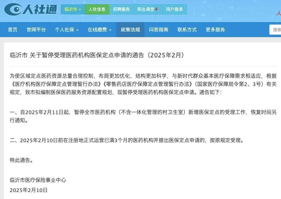 实际上,2025年以来,全国已经有不少地方发布暂停医保定点资格申请的通知。