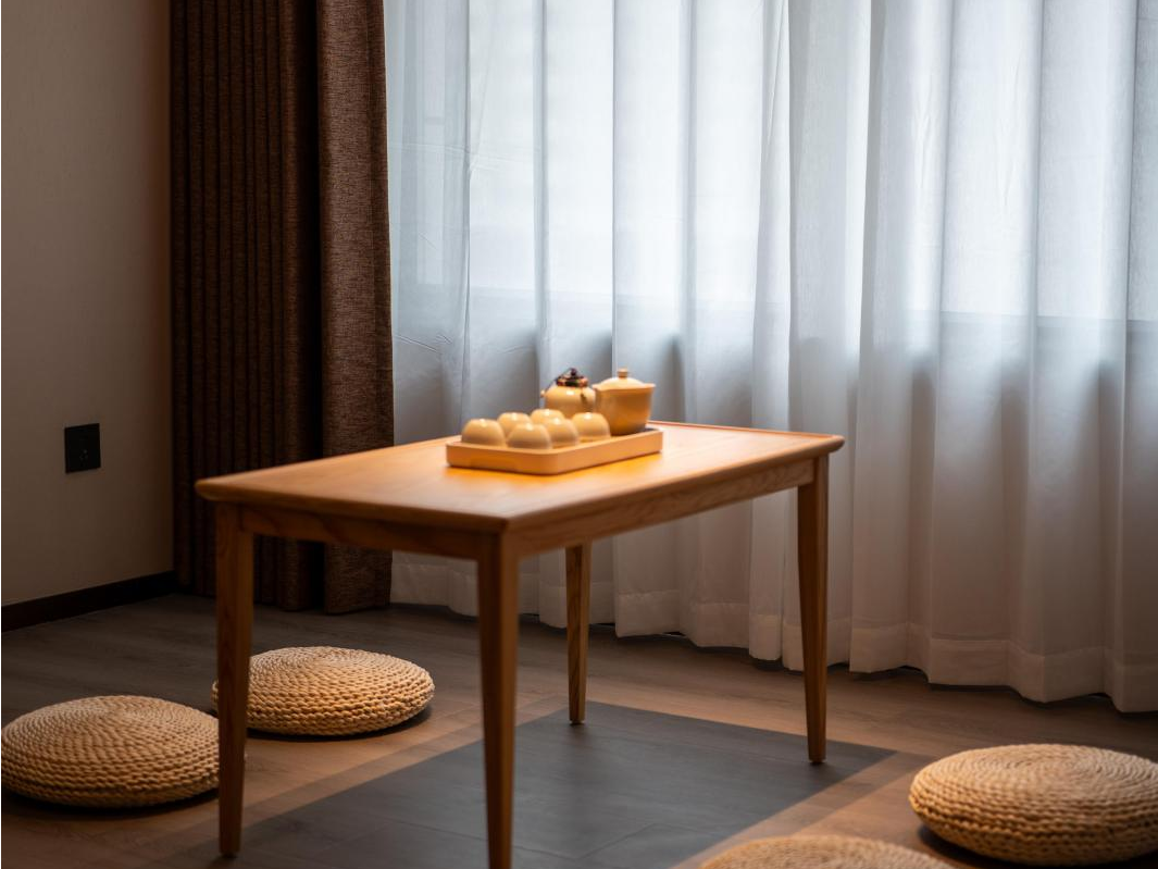 客房空间以低饱和色调奠定宁静基调,摒弃繁复,于简约中见雅意,意境深远。中式装饰,与甄选的原木古式家具相得益彰,灯具以柔和光线勾勒出温暖轮廓,使得木纹理的茶几、质感编藤坐垫更显细腻,为宾客营造安顿身心的休憩氛围。