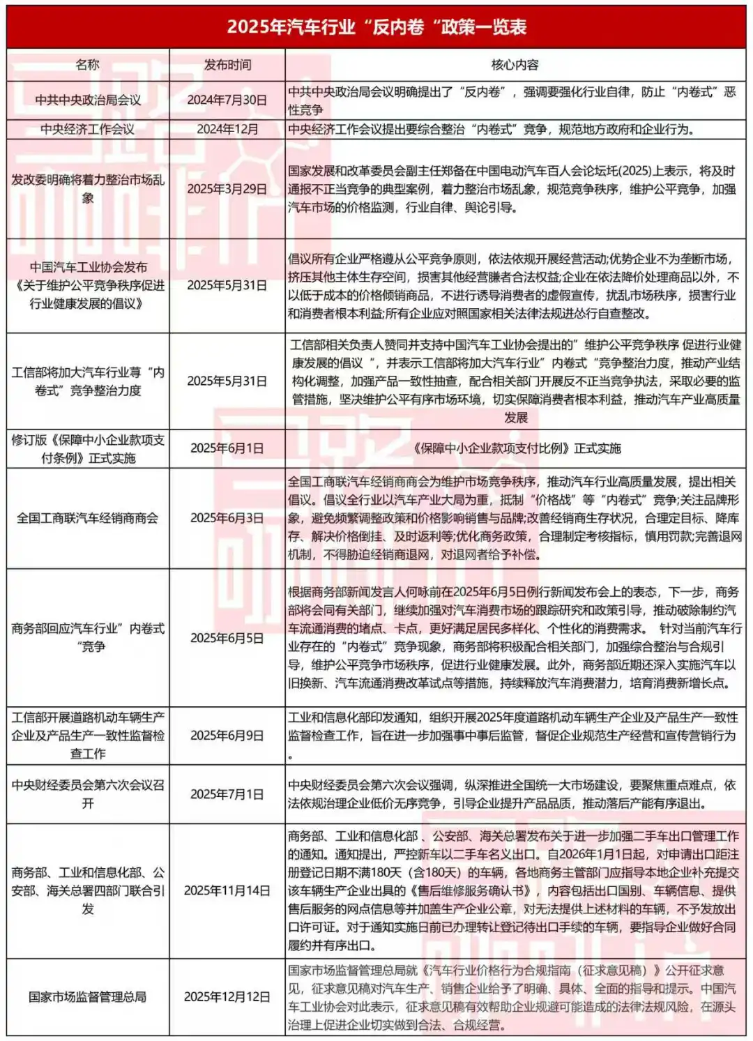 6月3日,全国工商联汽车经销商商会倡议抵制“价格战”等“内卷式”竞争;6月5日,商务部表态将加强汽车市场综合整治与合规引导;6月9日,工信部开展道路机动车辆生产企业及产品生产一致性监督检查工作,督促企业规范生产经营和宣传营销行为;7月1日,中央财经委员会第六次会议强调,纵深推进全国统一大市场建设,聚焦重点难点,依法依规治理企业低价无序竞争……
