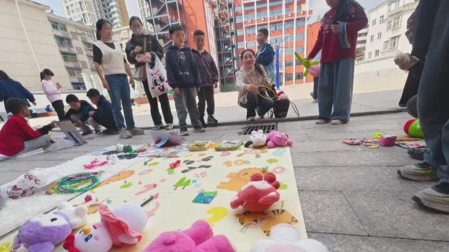 活动当天,校园内摇身一变成为热闹的“迷你商业街”,各班级摊位整齐排列,色彩鲜艳的招牌、充满童趣的摊位装饰,处处彰显着孩子们的奇思妙想。小“摊主”们提前到位,将精心整理的闲置物品一一陈列,童话绘本、益智玩具、可爱玩偶、精致文具、手工小物件等琳琅满目,种类丰富,吸引了众多同学驻足。