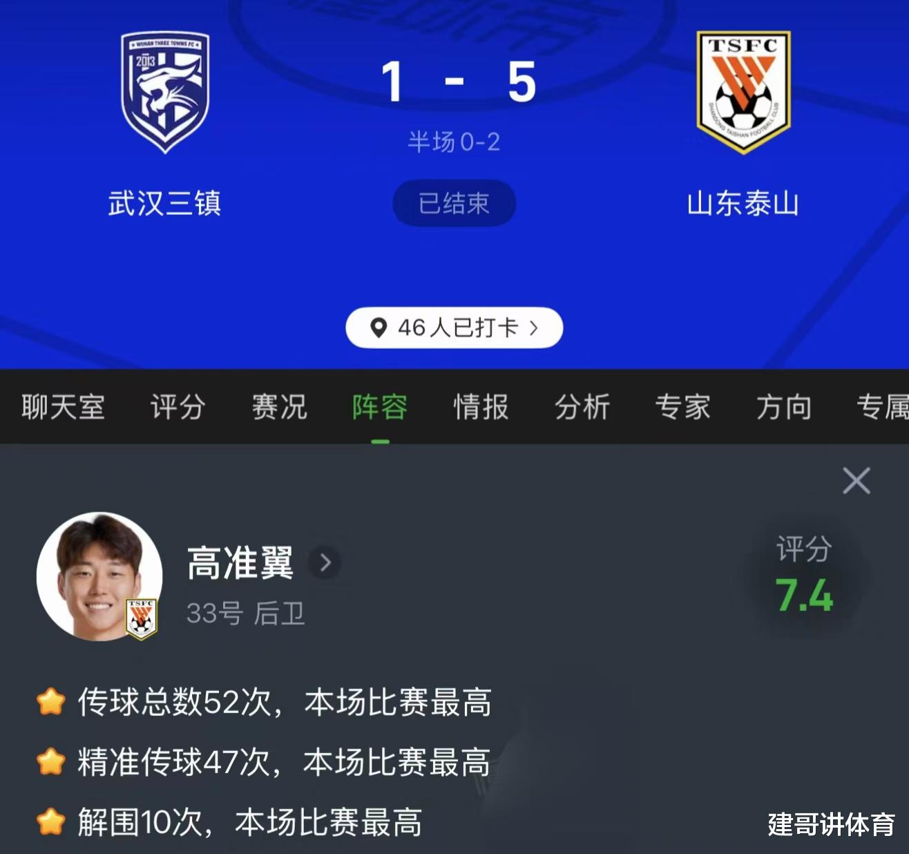 高准翼的3项第1分别是传球总数52次,本场比赛第1,、精准传球47次,本场比赛第1、解围10次,本场比赛第1,作为一名本土边后卫,能够做到3项第1,足以说明高准翼在泰山队后防线上的作用,假如高准翼没有得到出场机会,泰山队或许就不能以5-1的大比分战胜武汉三镇了。