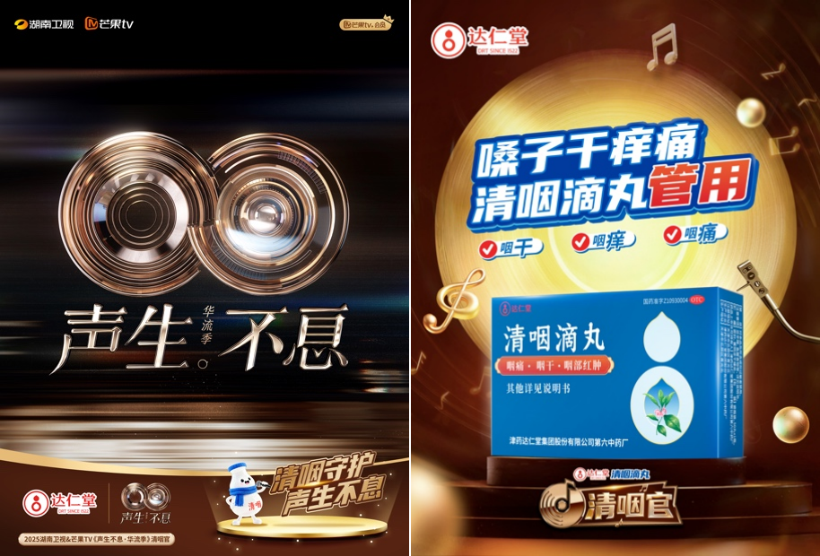 这个流感季,达仁堂清咽滴丸以“清咽守护,声生不息”为核心主张,化身“清咽官”携手湖南卫视、芒果 TV,深度合作音乐竞唱文化交流节目《声生不息・华流季》,实现品牌总曝光超18亿。