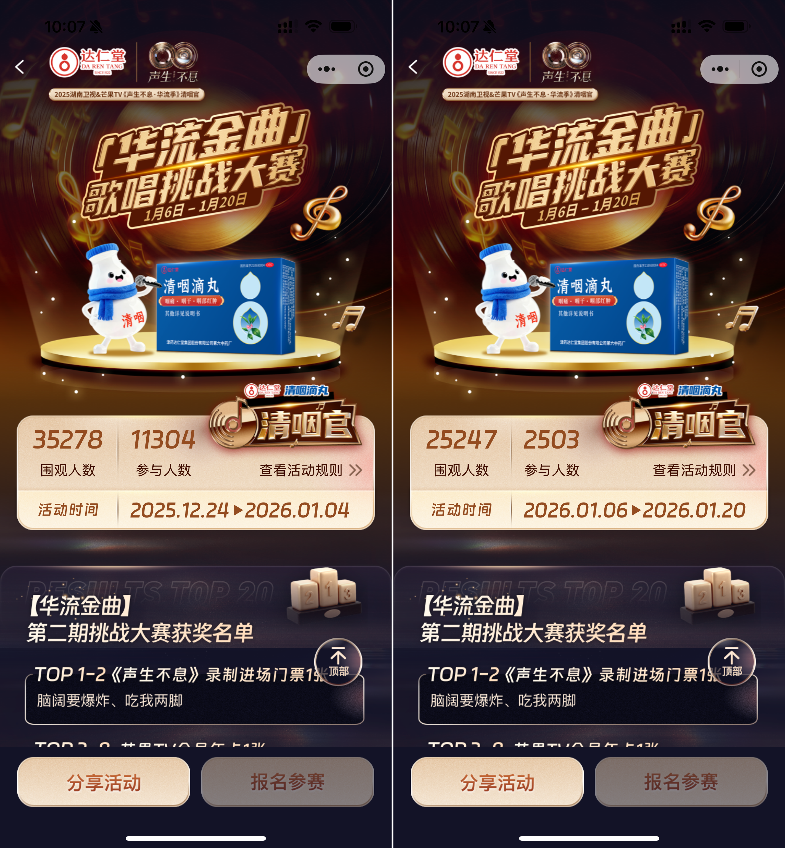 另外达仁堂清咽滴丸与咪哒音乐平台共同发起“华流金曲歌唱挑战大赛”,整合线下设备、小程序、公众号与抖音号等全渠道矩阵,打通线上线下互动场景,累计实现640万总曝光,让音乐与健康在冬日共鸣。