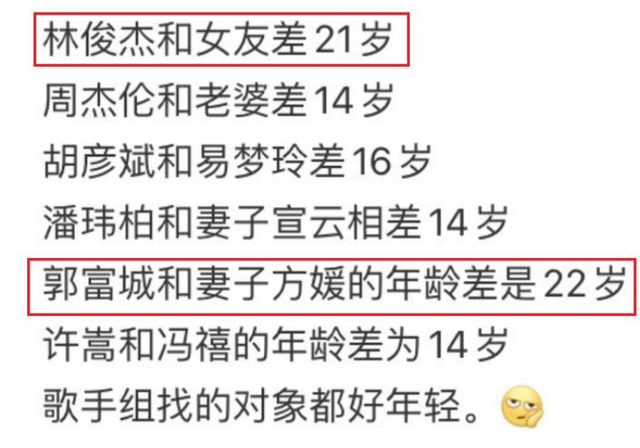 像周杰伦和昆凌相差了14岁,潘玮柏和宣云相差了14岁,郭富城和方媛相差了22岁,还有好多歌手找的另一半年龄差都超过了10岁。或许对于他们这些音乐人来说,另一半比自己年轻,能给自己带来更多激情和创作灵感。
