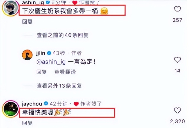 随后众星也是发出祝福,周杰伦喊话要幸福快乐,阿信第一时间冲进评论区玩梗:“下次庆生奶茶我会多带一桶”,林俊杰秒回“一言为定”,三人一唱一和把“奶茶梗”续上了新剧情。就连林志颖等艺人也赶来送上祝福,评论区星光熠熠,喜庆氛围直接拉满。