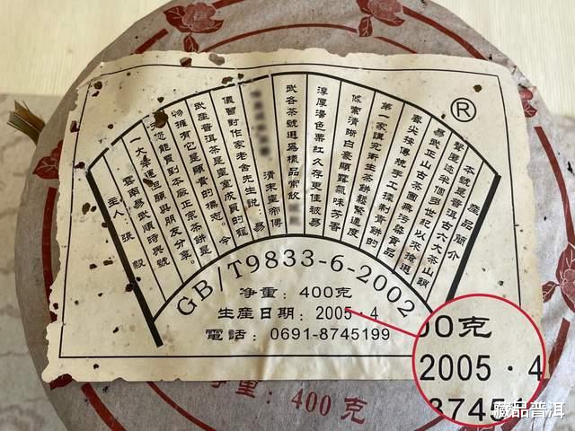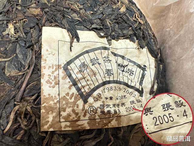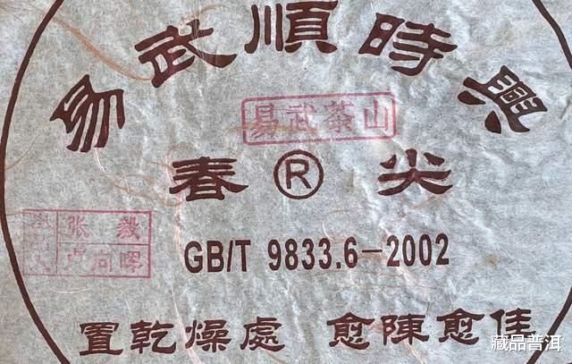 2005年顺时兴的茶版印刷为咖啡色,同一个批次里因印刷色差,还有褐红色等,都是正常现象。棉纸上还盖了两个印章,分别是“易武茶山”和“出品人:张毅、卢向晖”,辨识度很高。