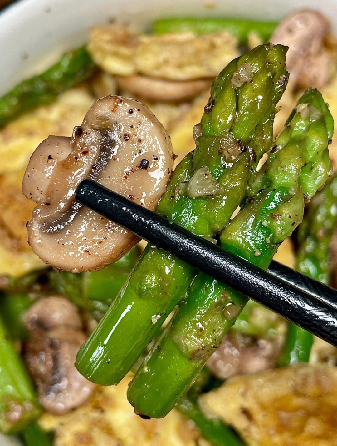 紧接着是炒香基底的环节。锅中再次喷入少许底油,放入蒜末煸炒,随着温度的升高,蒜香四溢,为整道菜奠定了诱人的底味。此时,迅速倒入切片的口蘑和焯过水的芦笋,转大火快速翻炒。在高温的激发下,口蘑会逐渐释放出内部的水分,变得软嫩且富有弹性,芦笋也迅速断生,两种食材在锅中交织,散发着浓郁的菌菇清香与蔬菜的鲜甜。