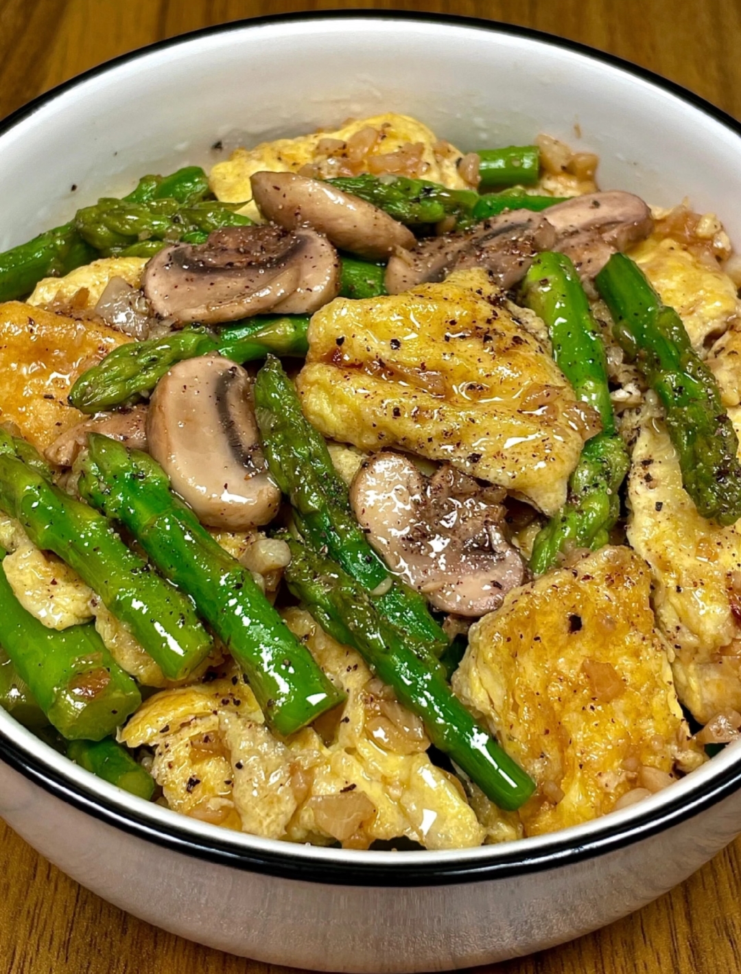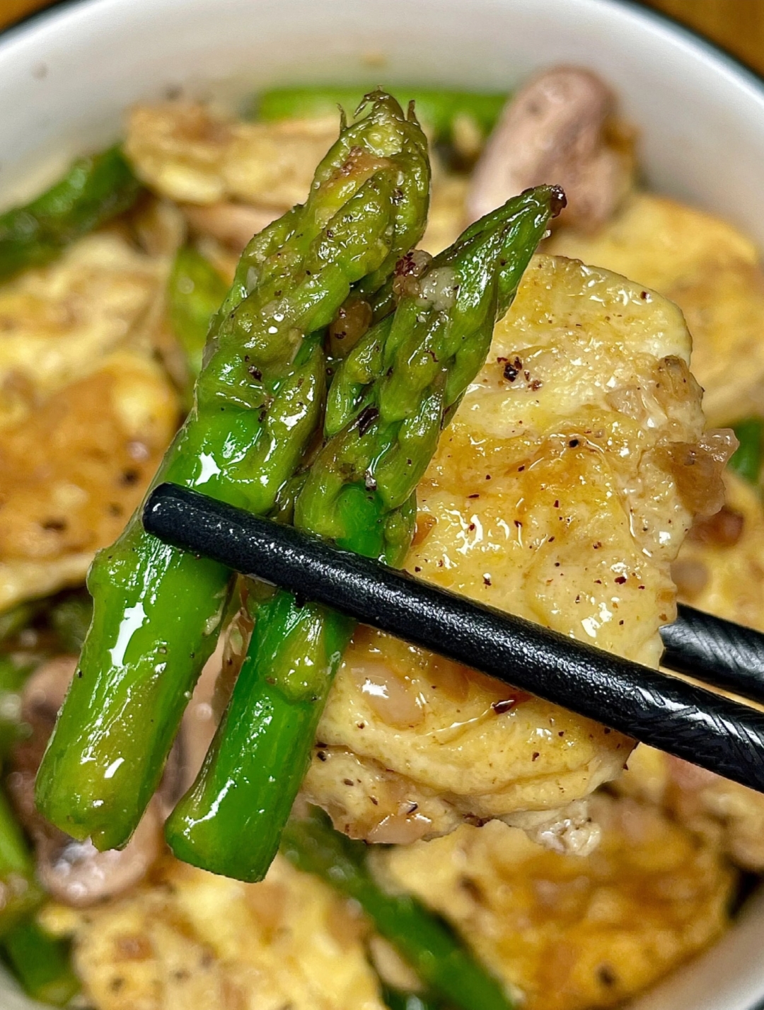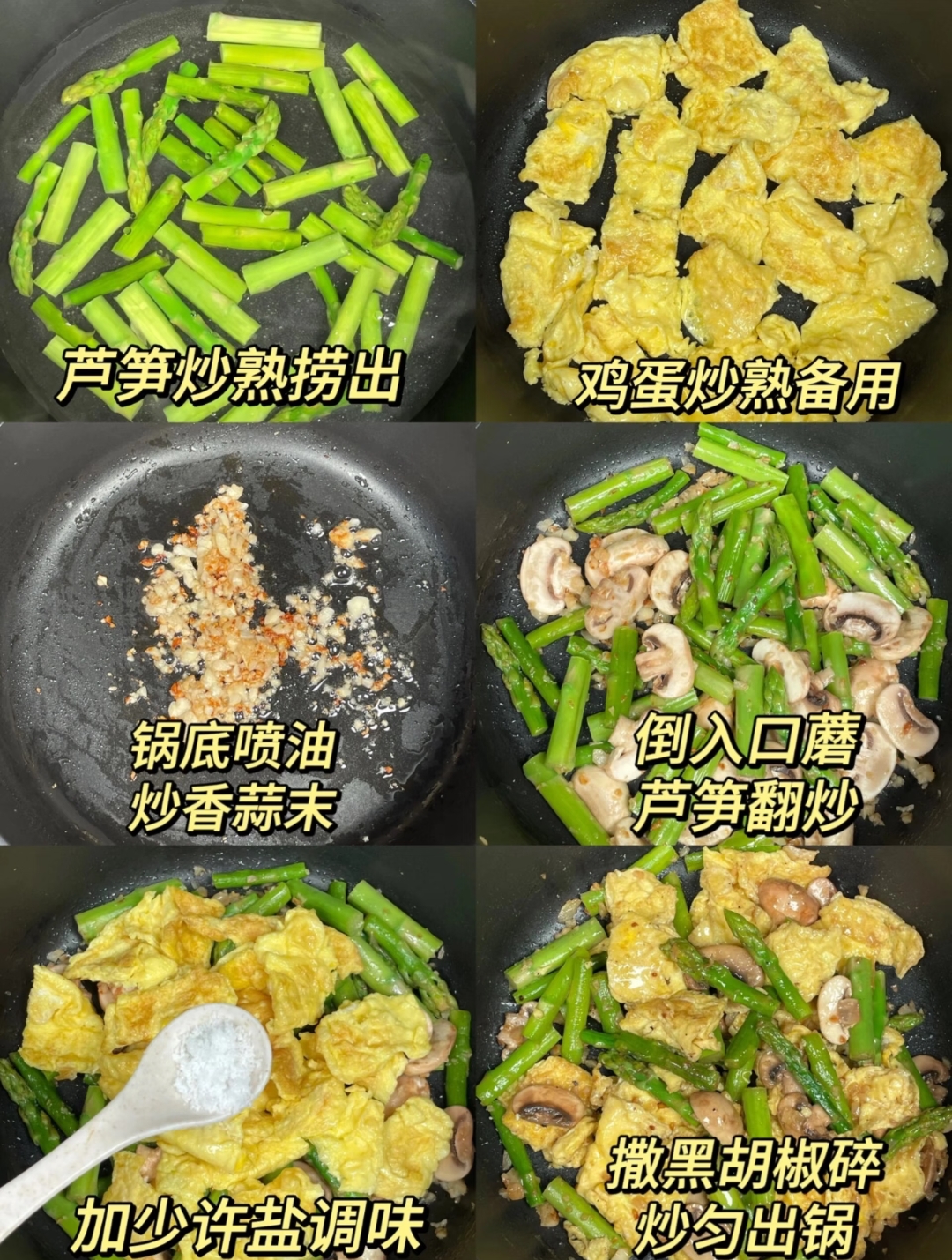 最后是混合调味与出锅的冲刺阶段。将之前炒好的鸡蛋倒回锅中,与口蘑、芦笋混合均匀。此时只需加入少许盐来提味,切记不要过咸,以免掩盖食材本真的鲜美。出锅前,撒上现磨的黑胡椒碎,那独特的辛香瞬间提升了整道菜的风味层次。翻炒均匀后即可关火装盘。这道口蘑芦笋炒鸡蛋,芦笋脆嫩,口蘑滑爽,鸡蛋蓬松,黑胡椒微辛开胃,每一口都是对味蕾的温柔抚慰,不仅低脂健康,更让人在品尝中感受到那份久违的轻盈与满足,是餐桌上不可或缺的一道亮丽风景。