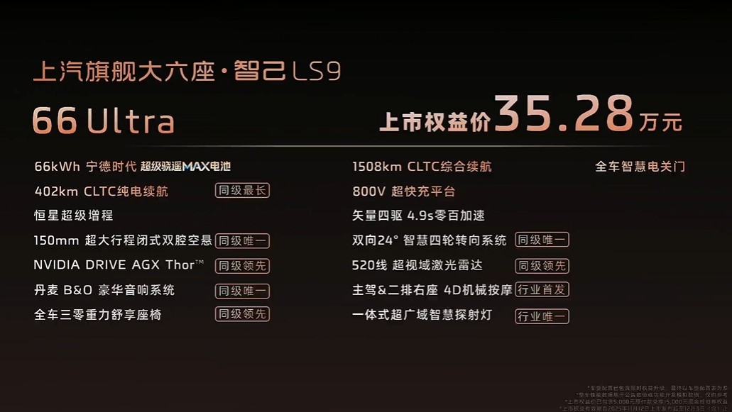 当下的“9系SUV”市场竞争异常激烈,潜在购车用户的选择非常多,但依旧无法掩盖智己LS9的强势表现。智己恒星超级增程系统+灵蜥数字底盘3.0带来的产品力提升,配合上汽集团的权威背书,让智己LS9形成了差异化竞争优势,这也是智己LS9一上市就能跻身“大六座9系SUV”核心圈层的关键因素。