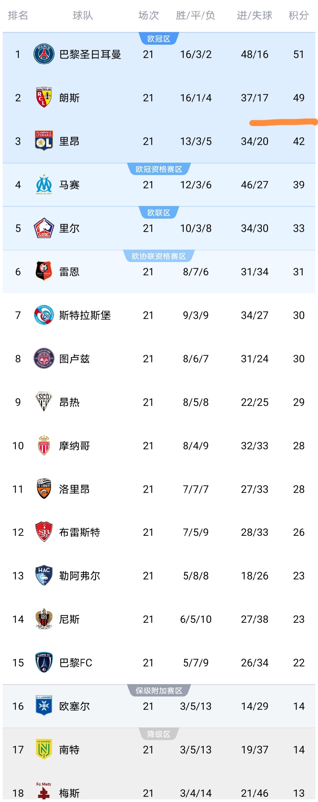 可以看到巴黎圣日耳曼队击败马赛队之后,积分上涨到了51分,再次反超朗斯队升至榜首的位置,而马赛队惨败之后,积分停留在39分,距离第3的里昂队3分,可以说马赛队依然有争夺到欧冠正赛席位的希望。摩纳哥战平尼斯之后,积分上涨到28分排名第10,落后第6的雷恩队3分,而尼斯队拿到1分之后,积分上涨到23分,领先降级区9分。勒阿弗尔队击败斯特拉斯堡队之后,积分上涨到23分,排名第13。