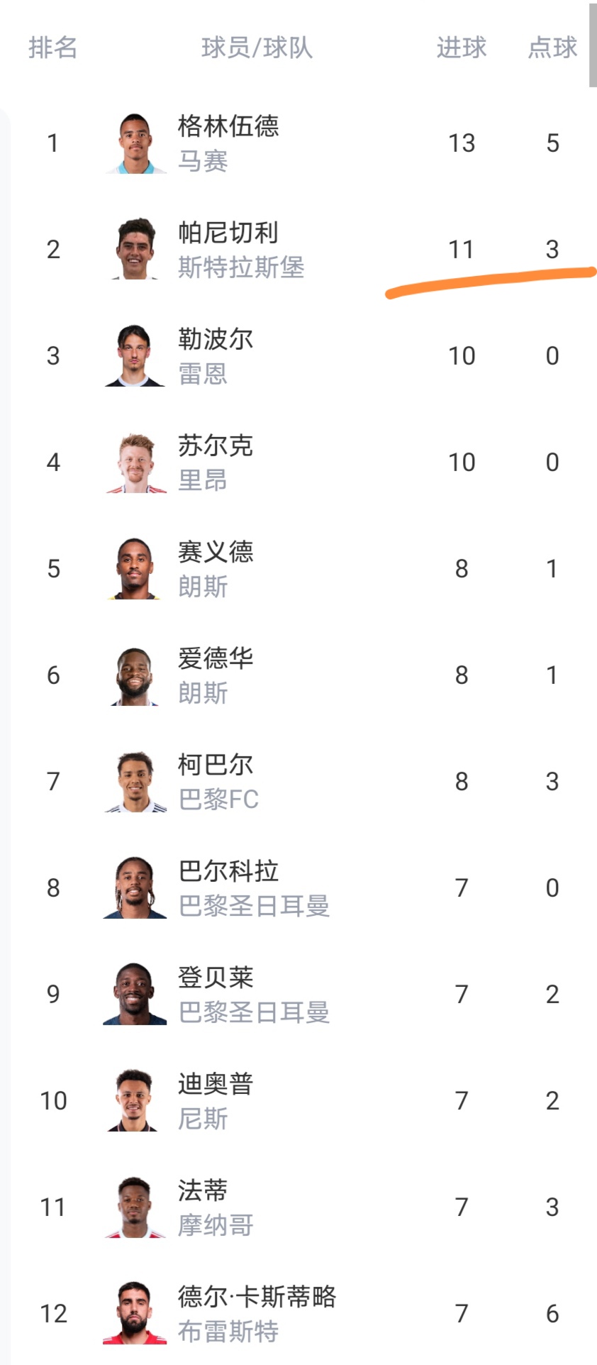 射手榜上曼联旧将格林伍德以2球优势领跑,法甲金靴的争冠白热化,多人进球上双。