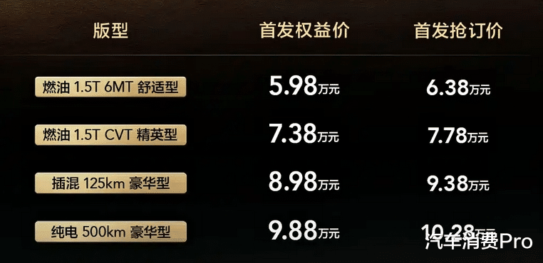 新车会提供燃油、插混、纯电三种动力形式。其中燃油版本使用1.5T发动机+6MT/CVT组合,最大功率为130kW,峰值扭矩290牛·米;插混版本搭载1.5L发动机+第四代10合1电机,带来125公里的CLTC纯电续航以及1100公里的综合续航;纯电动版车型搭载100千瓦电机+60kWh神炼电池,纯电续航达到500公里。