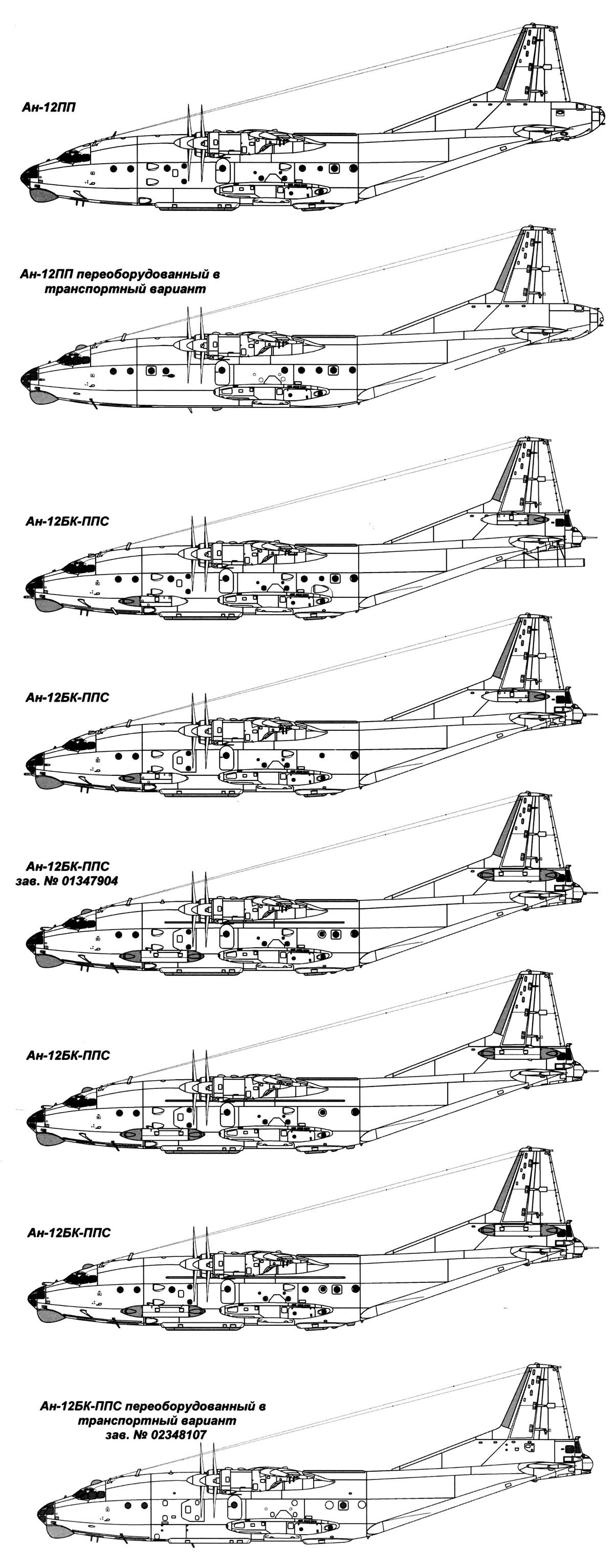 An-12BK-PPS的配置并不完全相同,有些飞机还配备了自动释放的 反雷达ASO-2I-E7R 偶极反射器发射器,两组可拆卸盒,位于起落架右整流罩内,后来还加装了红外干扰弹,以及不同型号的“豆子”、“花束”和“丁香-D”设备。大多数 An-12BK-PPS 未配备用于 APP-22 的笨重的反射器发射管。服役过程中,飞机上安装的干扰设备也在不断改进,外观上,各机在天线设备的安装细节上有所不同:翼尖增设了额外天线,有些“丁香”的接收天线被移至驾驶舱前方的透明整流罩上。
