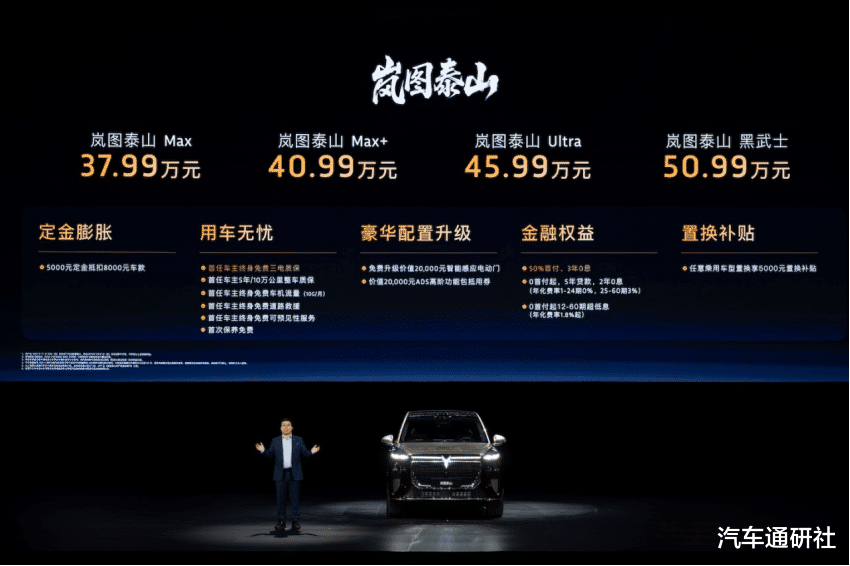 11月18日,岚图汽车正式将岚图泰山推向市场,共推出Max版、Max+版、Ultra版、黑武士版四大版型,官方指导价为37.99万元-50.99万元。