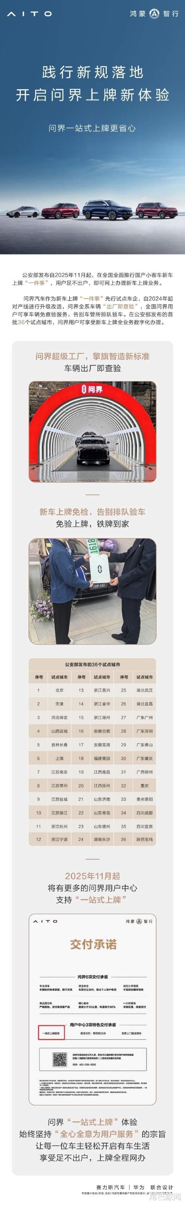 从技术对接公安部预查验系统,到全国 36 城门店的「一站式上牌」及「1小时办结」服务,自 2025 年 11 月起,部分车型更可实现「一次都不用跑」的全程网办,问界构建了一套高效、便捷的交付体系。