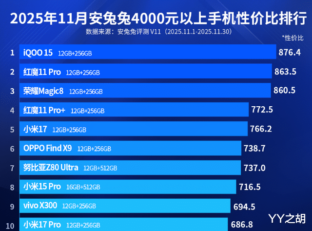 具体来说,在安兔兔2025年11月份4000元以上手机性价比排行榜中,iQOO 15和红魔11 Pro分列第一名和第二名。在安兔兔平台上,这两款智能手机的性价比评分分别为876.4分和863.5分。其中,红魔 11 Pro 搭载的第五代骁龙 8 至尊版处理器,搭配台积电 3nm 工艺,CPU 性能提升 20% 的同时,能效还优化了 35%—— 简单说,就是 “性能更强、还更省电”。