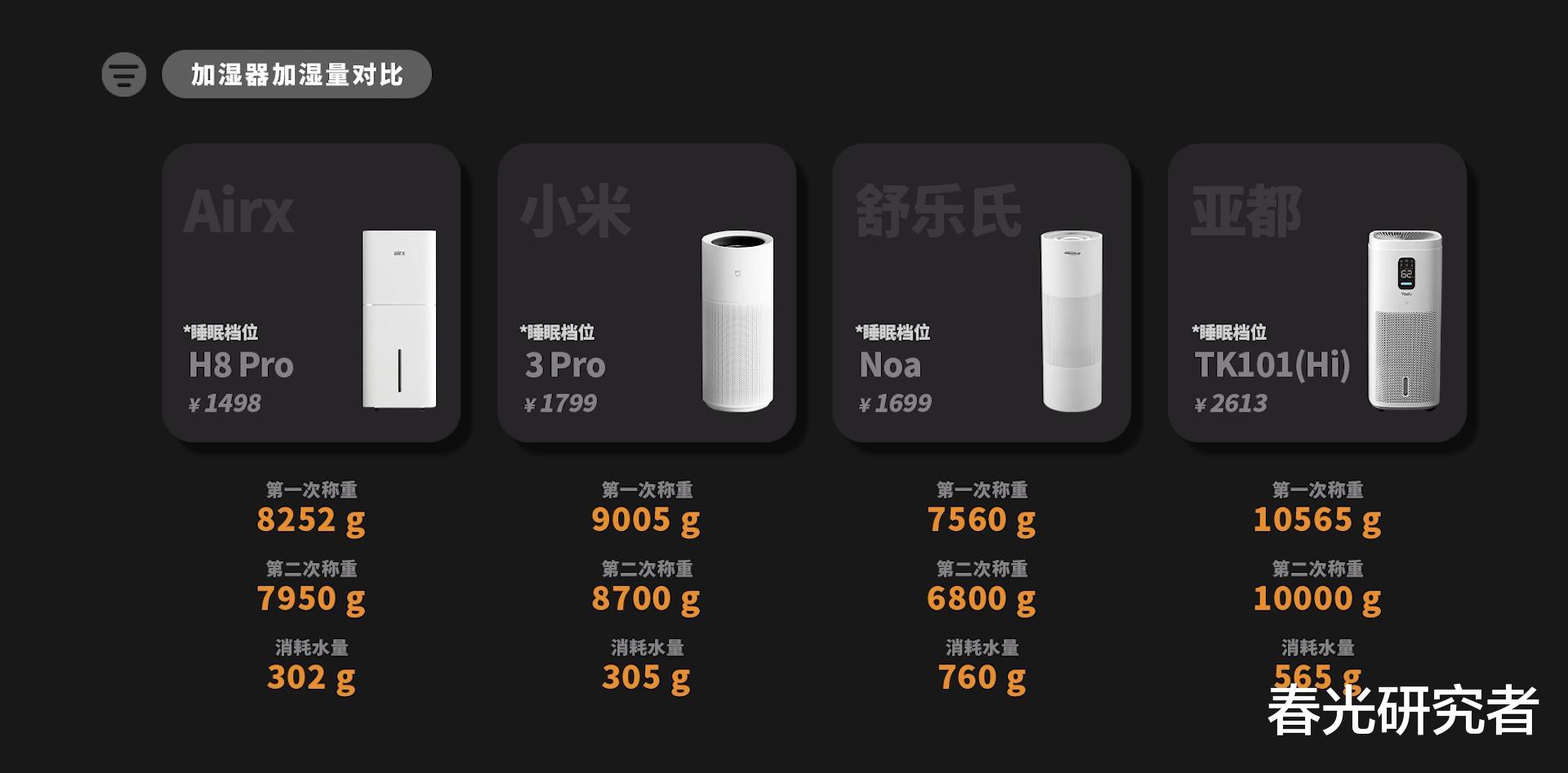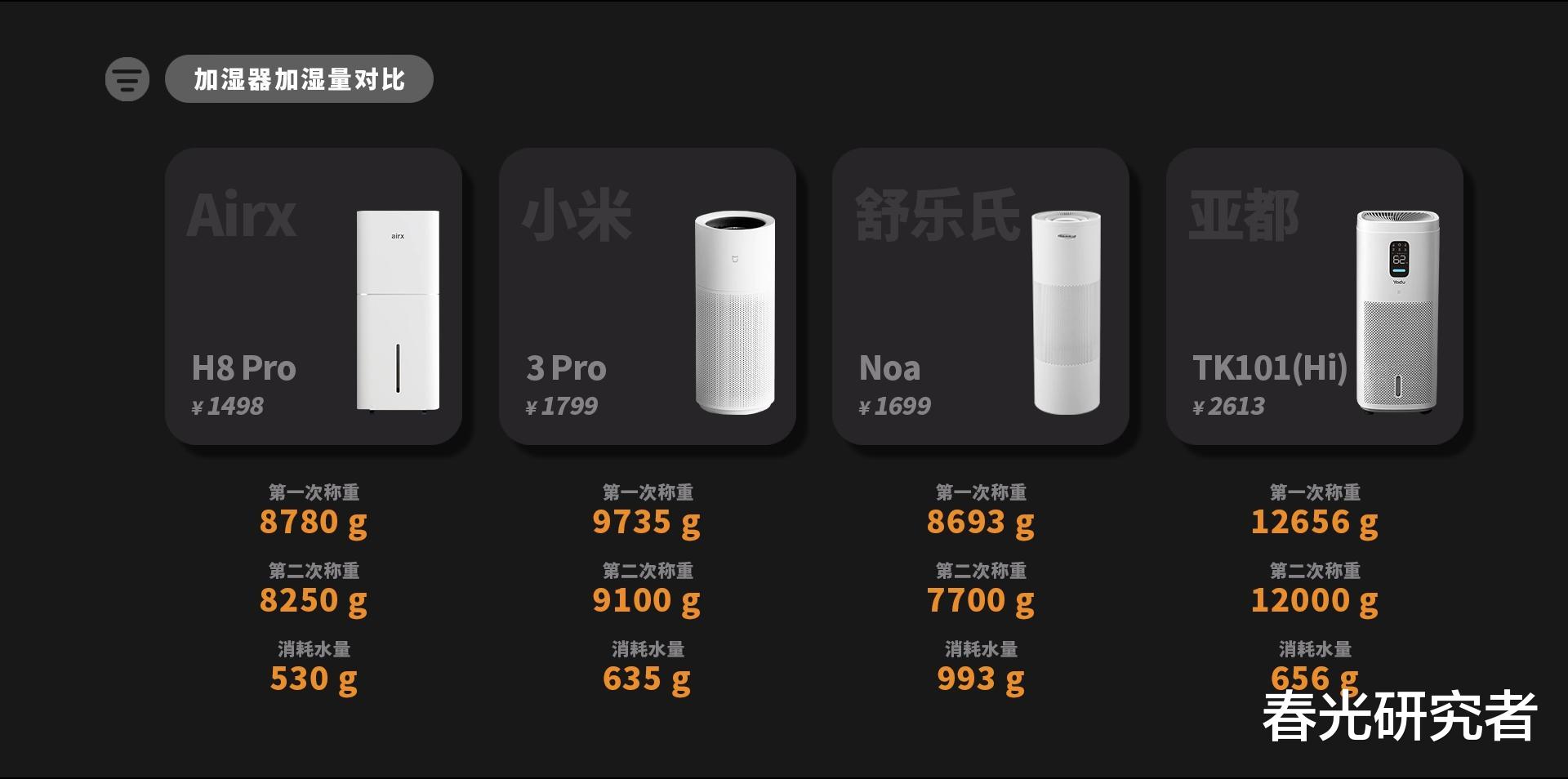 关于加湿前后的机器重量,我们也同步测了,水量消耗第一是舒乐氏,760g,第二是亚都,565g,Airx和小米都只有300g多点,只是舒乐氏的一半,差距非常大。