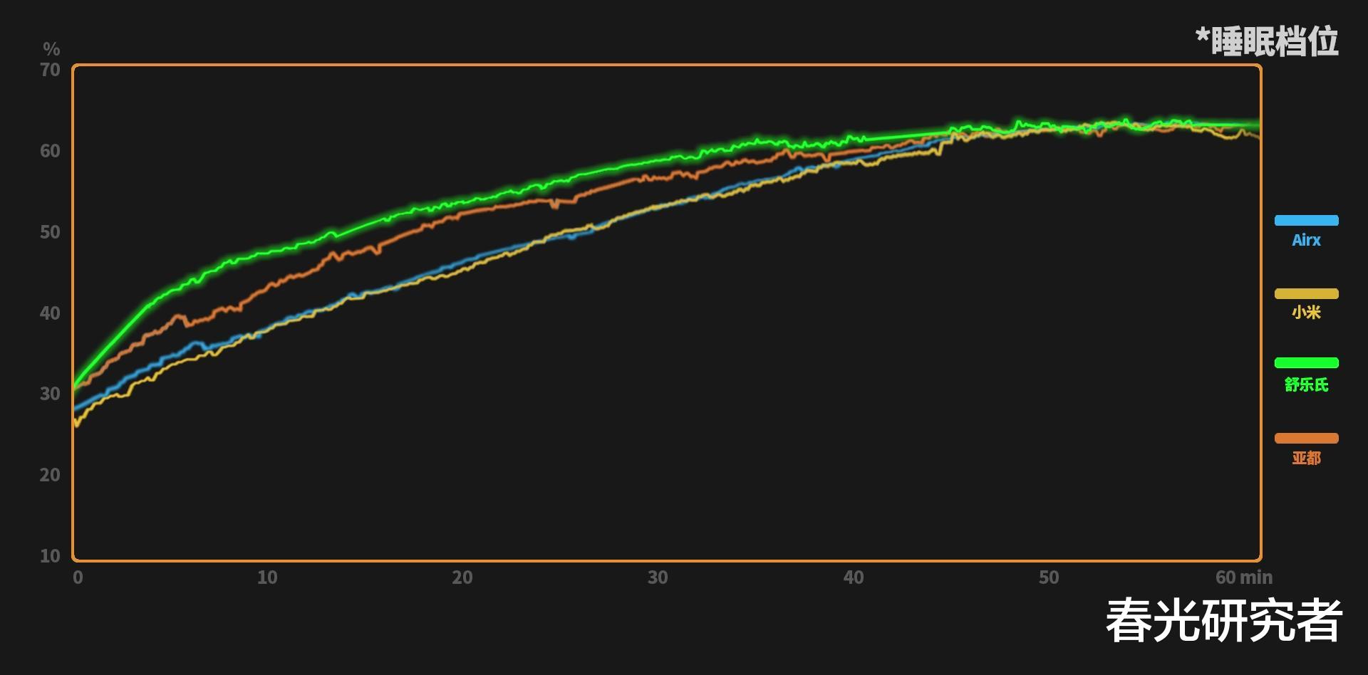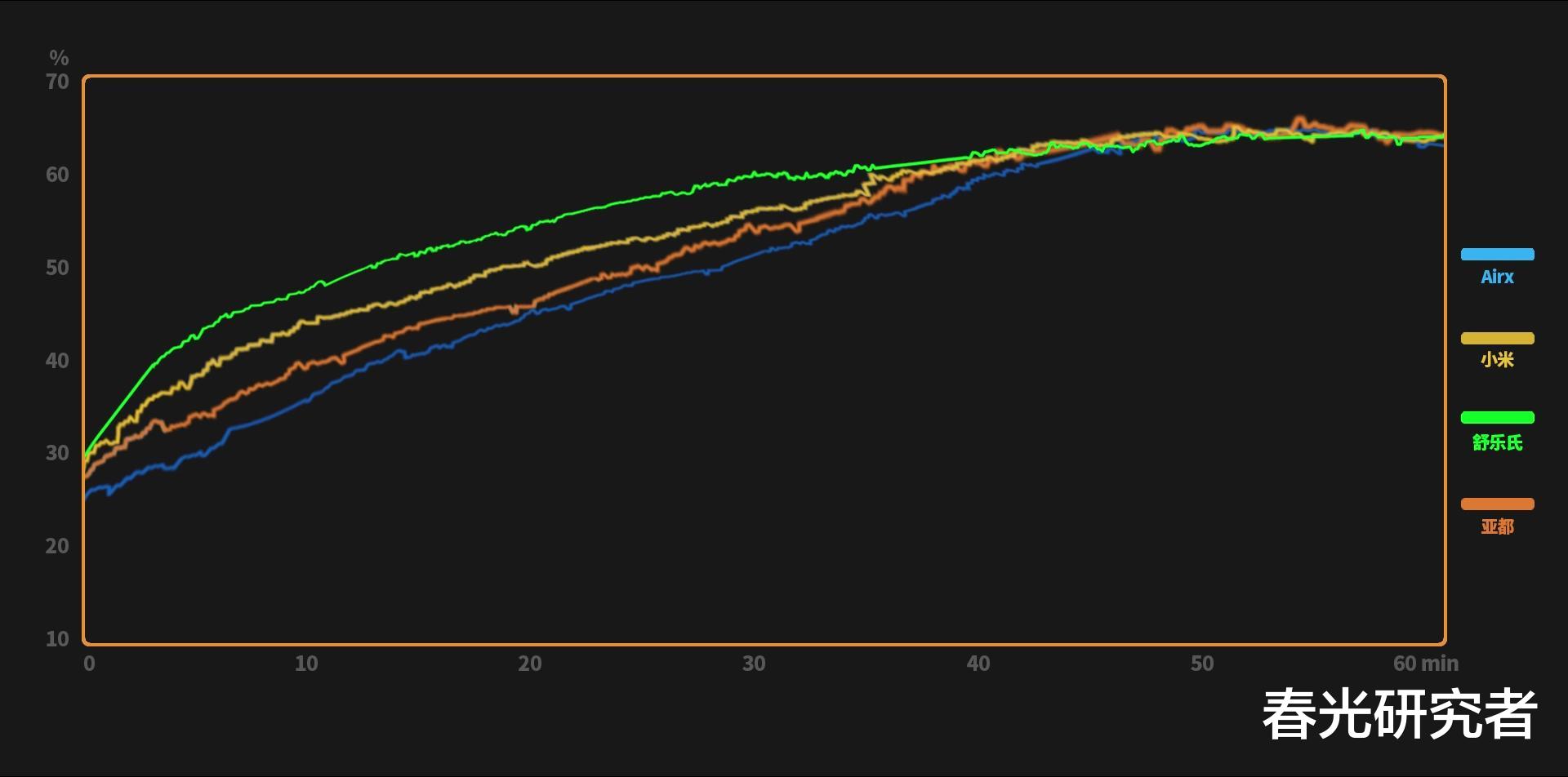 来看结果,我们统计了三个测试点的平均值,从加湿速度上来看(1小时),舒乐氏是全程领先,第一个把湿度提升到60%以上。亚都和小米比较接近,前半段的湿度爬升稍慢了一点,后面才逐渐升上来。最后是Airx,姗姗来迟,加湿速度要慢很多。