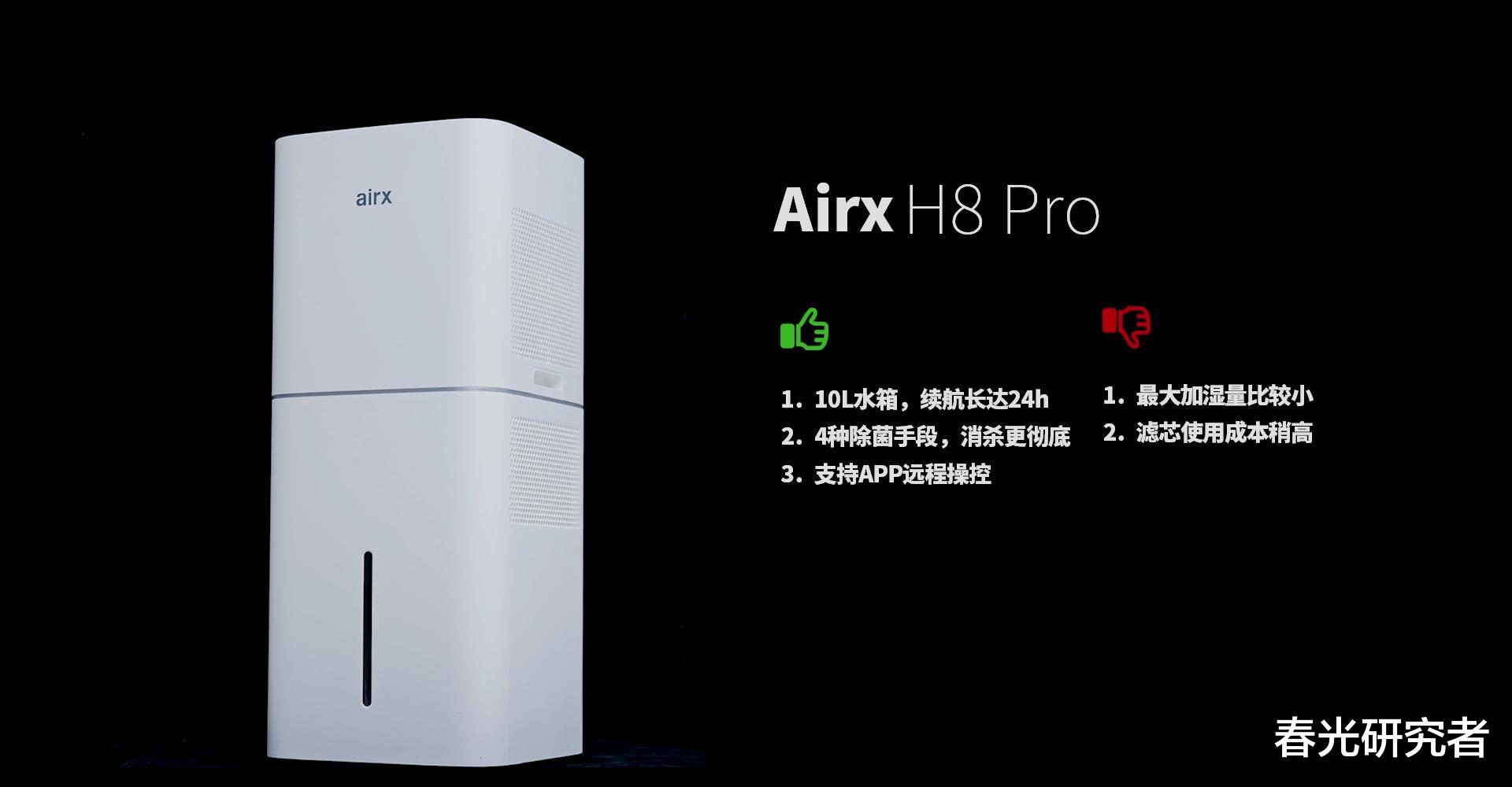 然后是Airx气熙H8 Pro,10L大容量水箱,续航时间约24小时,除菌配置也很丰富,就这款加湿器来说,Airx的诚意还是很足的。