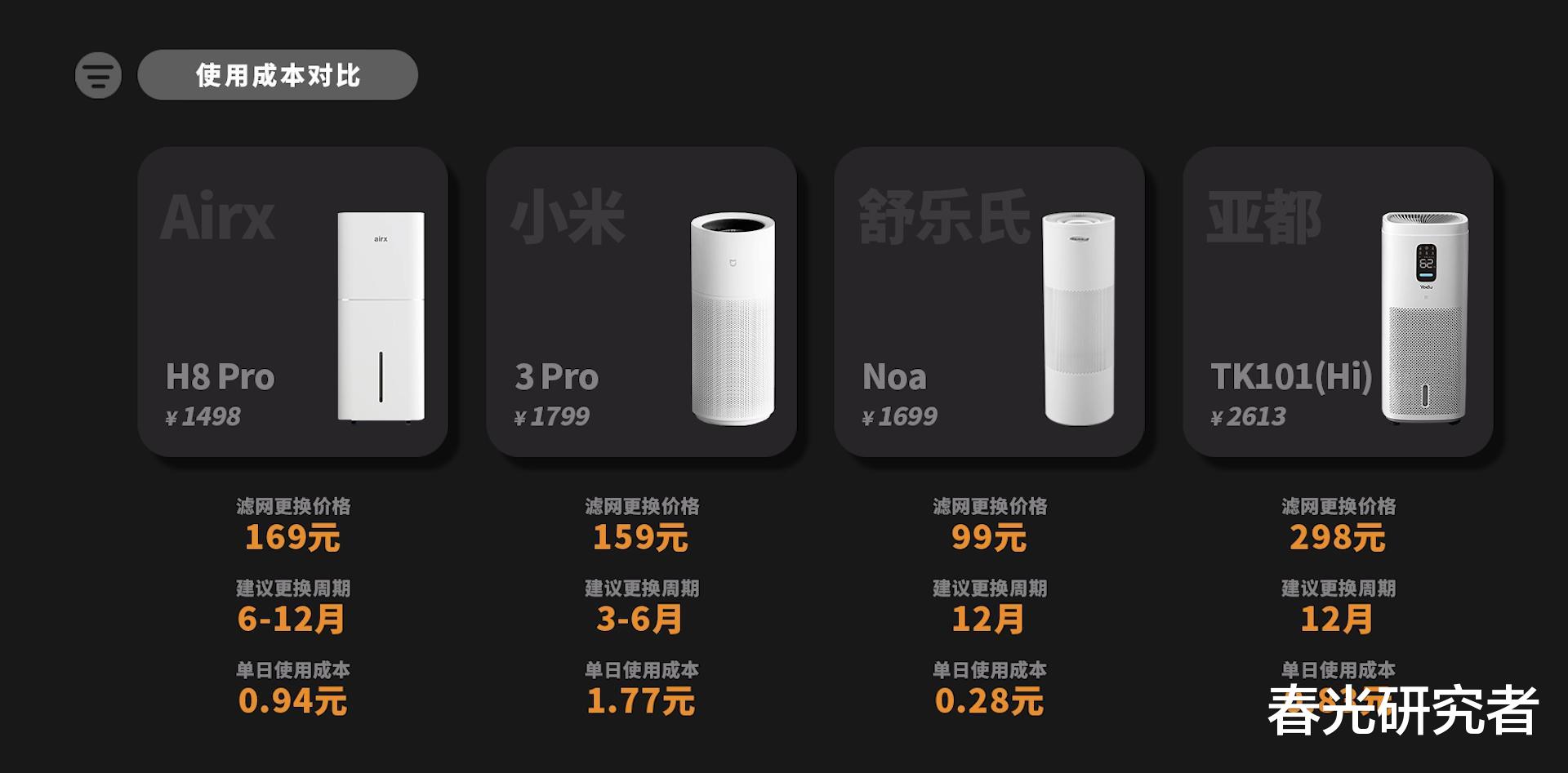 我们统一按照建议使用时长的最低值来计算,Airx单日使用成本是0.94元,小米是1.77元,舒乐氏是0.28元,亚都是0.83元。是不是有些意外?可以清理更彻底的舒乐氏滤网,反而使用成本最低。