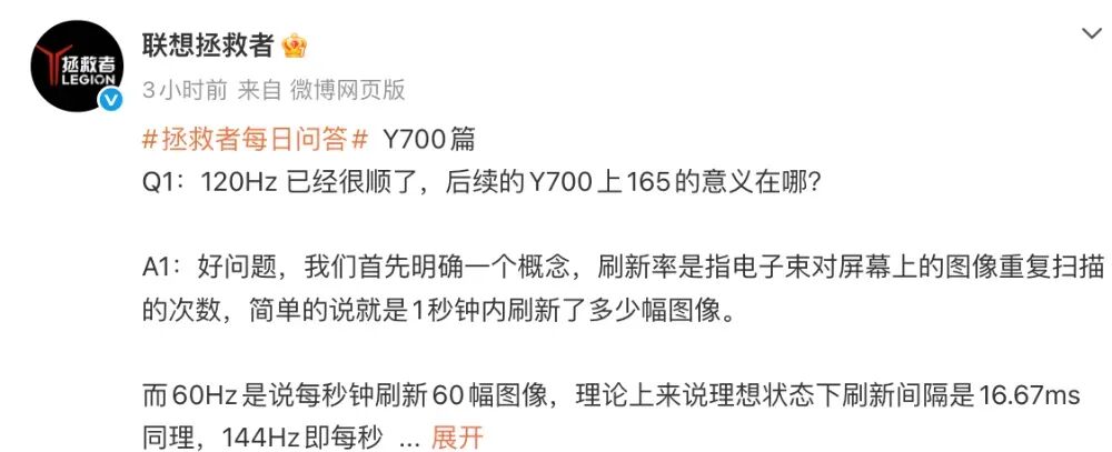 对于“120Hz 已经很顺了,后续的Y700上165的意义在哪?”这一问题,官方回答显示: