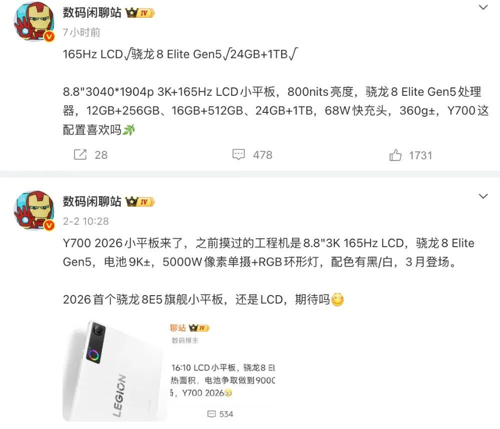 结合来看,Y700 2026小平板工程机是8.8"3K 165Hz LCD屏幕,核心搭载骁龙8 Elite Gen5,电池9K±,配备5000W像素单摄和RGB环形灯,配色有黑/白。提供12GB+256GB、16GB+512GB、24GB+1TB等规格,配备68W快充头,机身重360g左右。