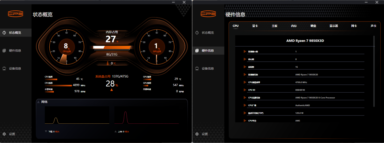 本次测试的核心是AMD锐龙7 9850X3D处理器。它完整继承了3D V-Cache大缓存技术,8核16线程的架构下总缓存高达104MB,能够从容应对复杂游戏场景。同时加速频率提升至5.6GHz,单核性能进一步释放,无论是日常应用还是高帧率电竞,都能提供充沛动力。