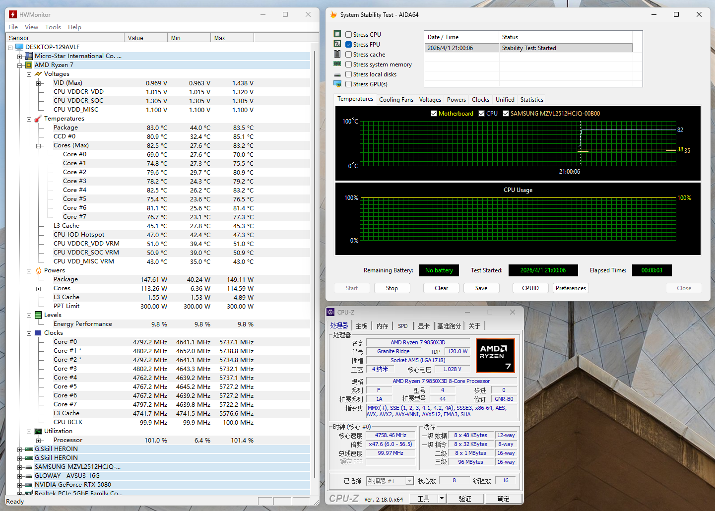 装机完毕必须跑跑分看看这套配置的表现如何。9850X3D采用手动PBO设置,FPU烤鸡八分钟,9850X3D电压为1.028V,功耗147.61W,温度维持在83度。实测证明超频三银翼Max可以轻松压制超频状态的9850X3D,散热表现非常给力。