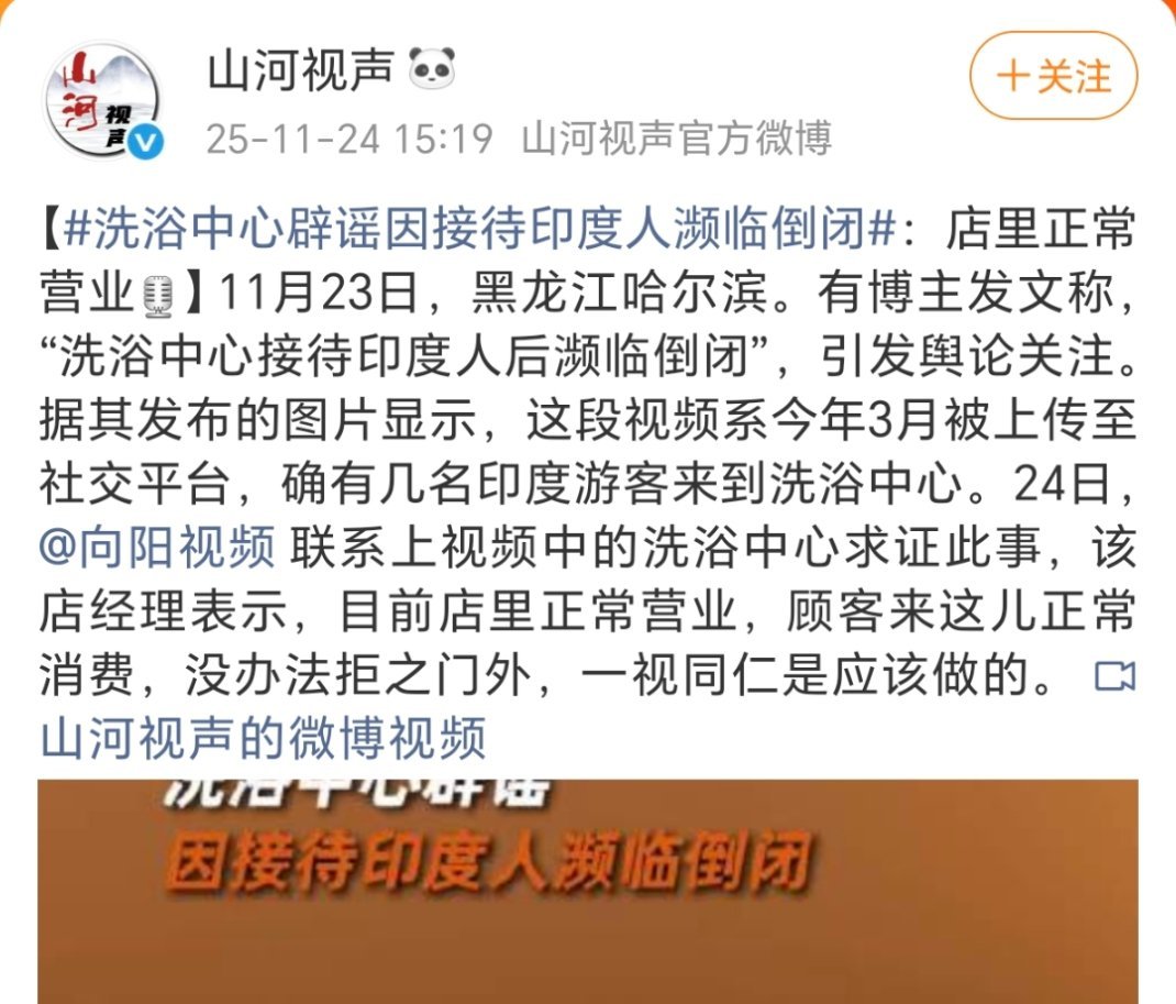 之后,网络还热议“洗浴中心接待印度人后濒临倒闭”的传闻。这家洗浴中心经理回应道:“目前店里正常营业,对所有顾客一视同仁,没办法拒之门外”。