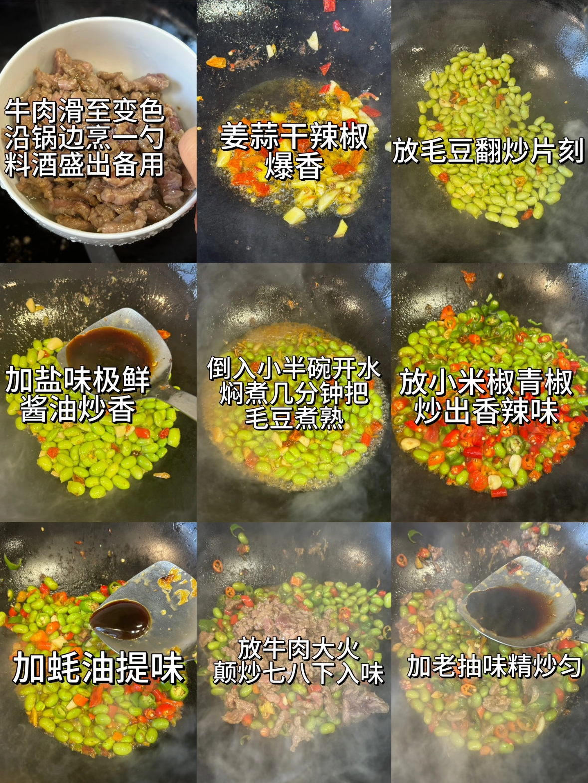 先说食材准备。牛肉建议用牛里脊或者黄瓜条,这两个部位最嫩,没有筋膜,切的时候要逆着纹路切薄片,大约两个硬币的厚度。切好的牛肉片放入碗中,加少许盐、一勺料酒、半勺淀粉、一点点小苏打(可以让牛肉更嫩,没有也可以不放),抓匀后淋半勺食用油锁住水分,腌制十分钟。毛豆要选新鲜带壳的,自己剥出来颜色最绿、口感最脆,如果买现成的剥好的,注意看一下有没有老豆。姜蒜切末,干辣椒剪成小段,小米椒和青椒(可以用线椒或螺丝椒)分别切圈,青椒是为了增加清香味,小米椒负责提供鲜辣。另外准备好味极鲜酱油、老抽、蚝油、盐、味精和一小碗开水。