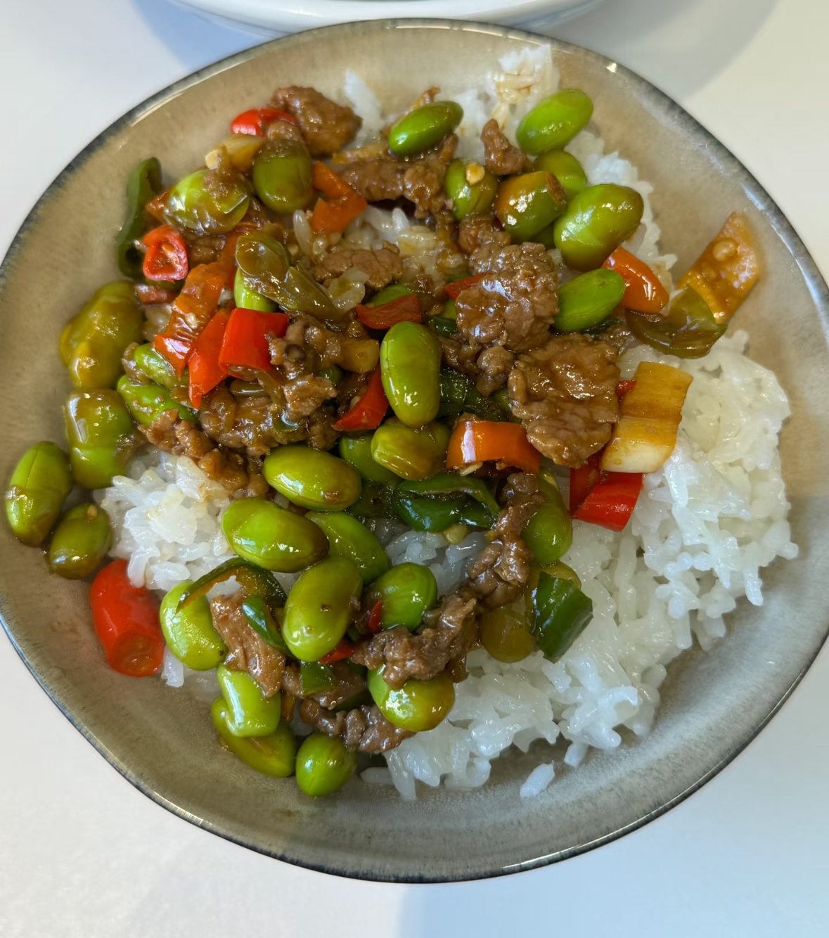 出锅前可以尝一下咸淡,因为之前放过盐、酱油和蚝油,通常不需要再加盐。装盘上桌,只见碧绿的毛豆、红的小米椒、青的线椒、褐色的牛肉片,色彩明快,油润光亮。夹一筷子送入口中,牛肉滑嫩中带着嚼劲,毛豆吸饱了汤汁,咬开来是清甜和咸鲜的交织,紧接着辣椒的后劲涌上来,辣得额头微微冒汗,却越吃越停不下来。那种辣不霸道,不呛喉,而是和毛豆的清香、牛肉的肉香完美融合在一起,让人忍不住一勺一勺往饭碗里舀。