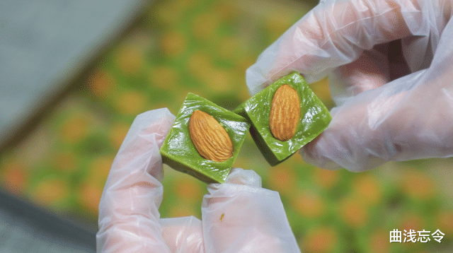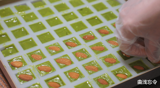 7、加巴旦木:趁热糖液还未凝固,将巴旦木按压在每一个模具的糖液顶部,稍稍用力使其镶嵌入糖液。