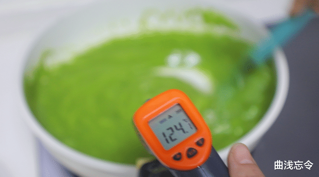 5、加抹茶:温度在118℃时加入融化且保温着的抹茶液,加入的时候注意细水长流,一边加一边要快速的顺着一个方向搅拌,使其混合均匀。后期熬制时要随时观察颜色和测量温度,在118-124℃之间关火。