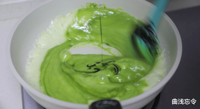 5.加抹茶液的时候一定要一边加入一边快速地顺着一个方向不停搅拌,一直到抹茶液与糖液完全混合。推荐假如的时候细水长流式,避免大面积加入的温差骤变而导致不易融合的情况出现。