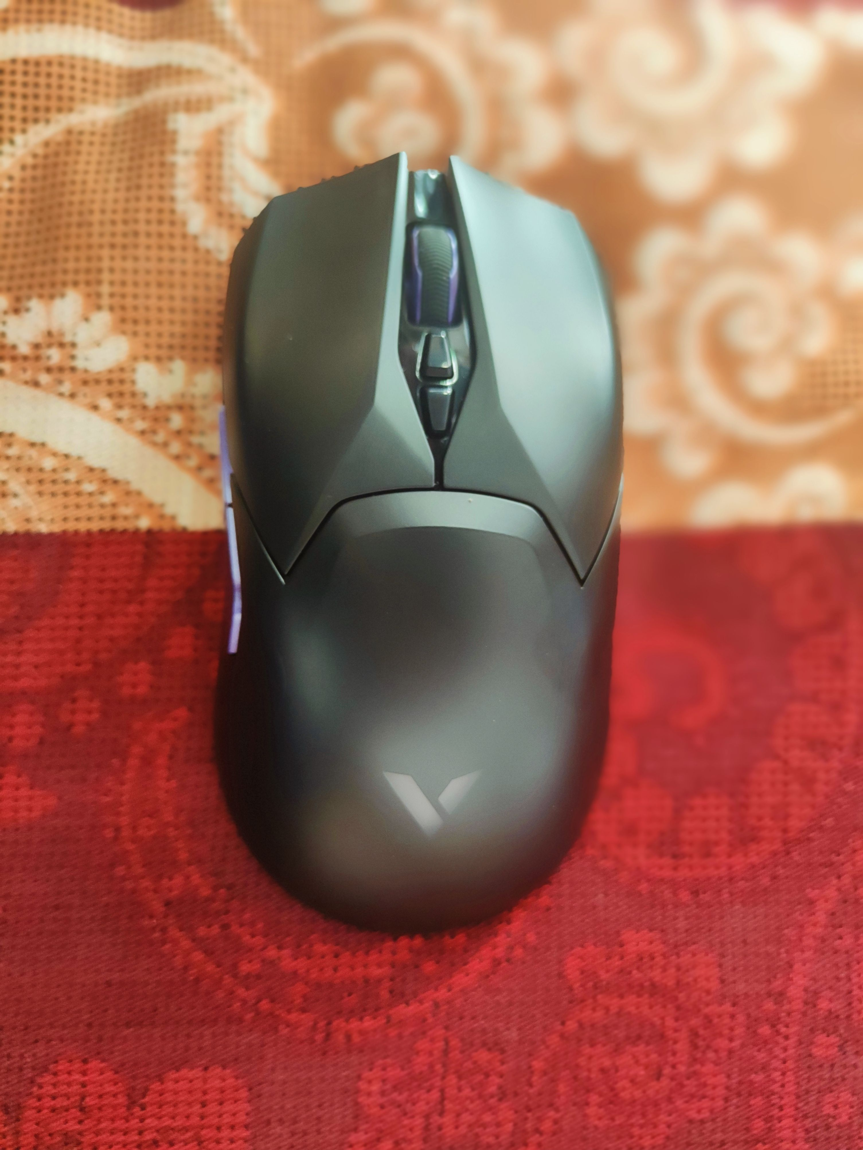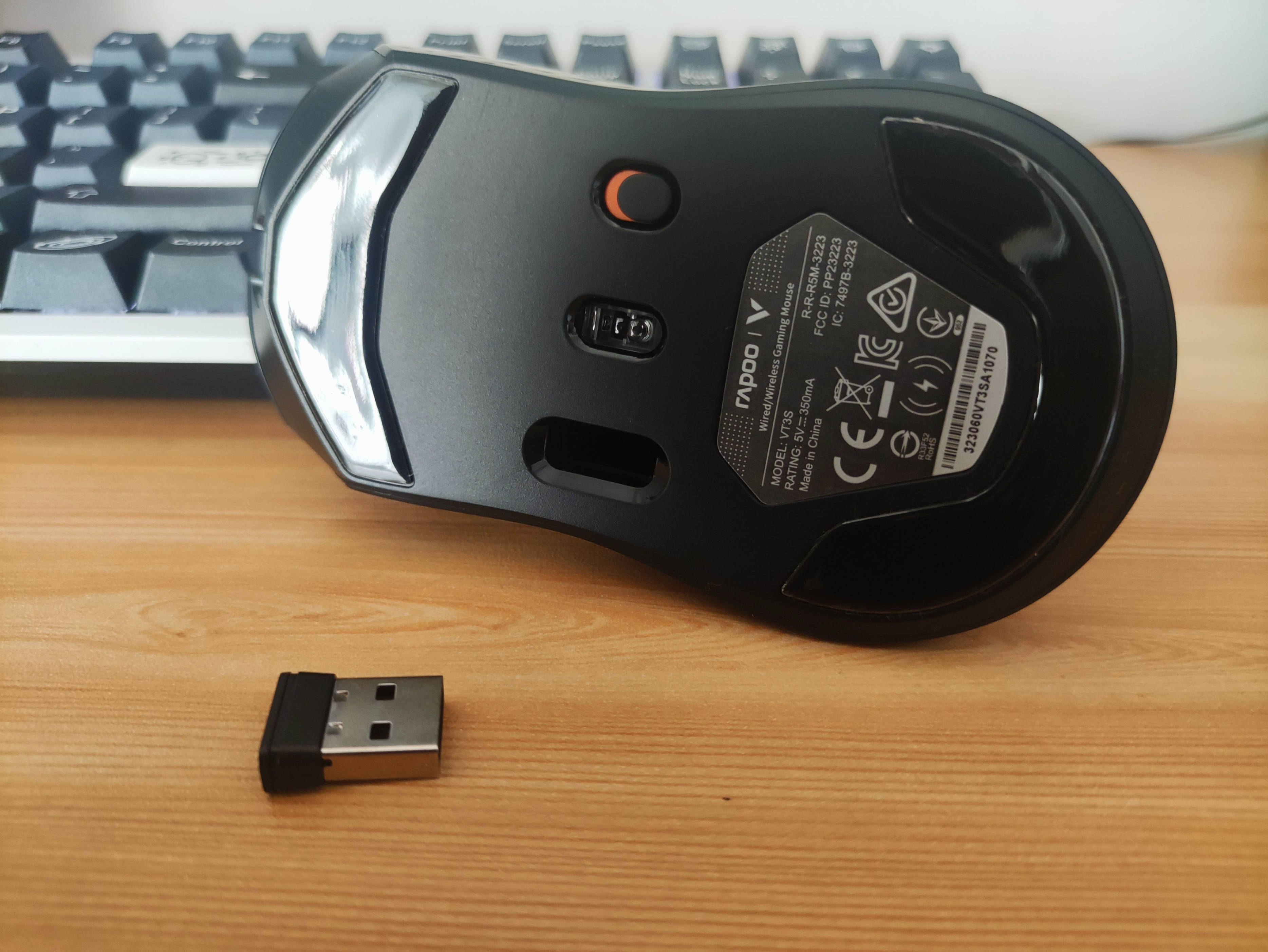 鼠标顶部后端有个V型LOGO,这里配备了1680万色的RGB背光灯,可以通过驱动程序进行调整和设置,体现出产品的可玩性和拓展性。内部还配备了FPC独立天线,加上Nordic低功耗芯片,在保持长续航的同时还保证了无线连接的稳定性。按键反馈及时不断联,真乃打游戏必备神器。