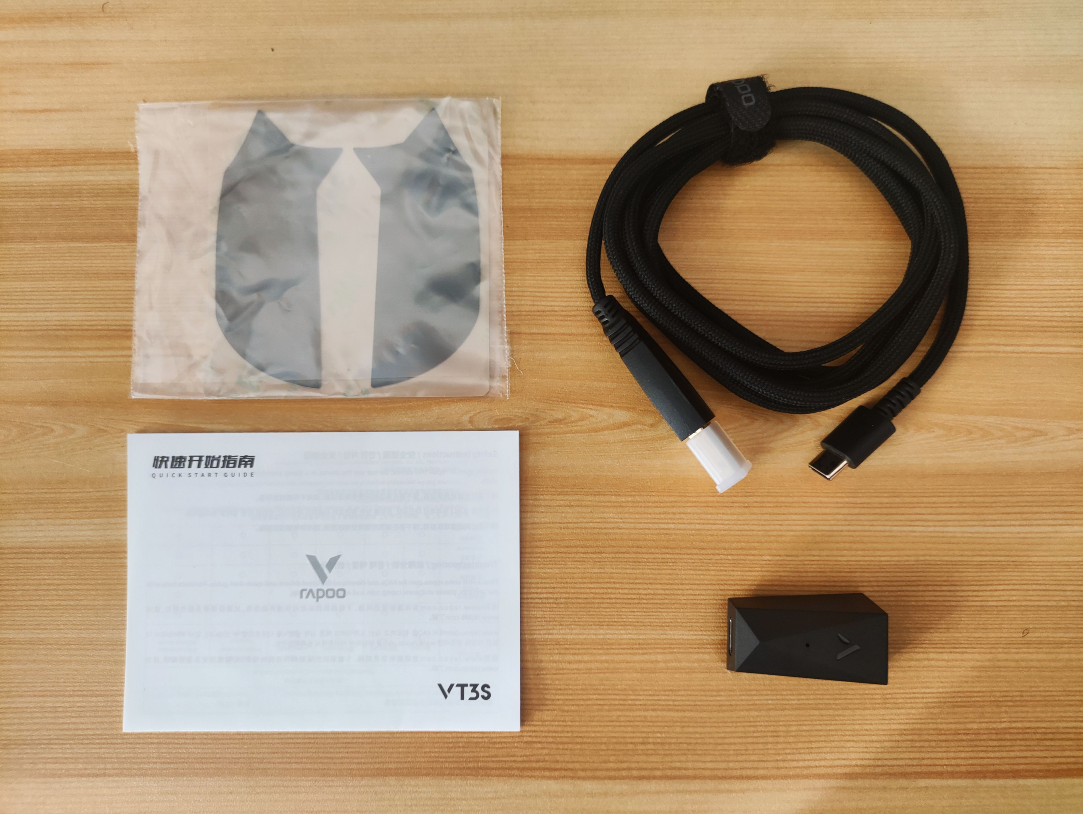 打开包装封盖,可以看到VT3S双模鼠标的本体,再打开鼠标下方的隔板,依次可以取出配件:1.8m伞绳材质电源数据线、 USB转接器、备用防滑贴和产品说明书等等。