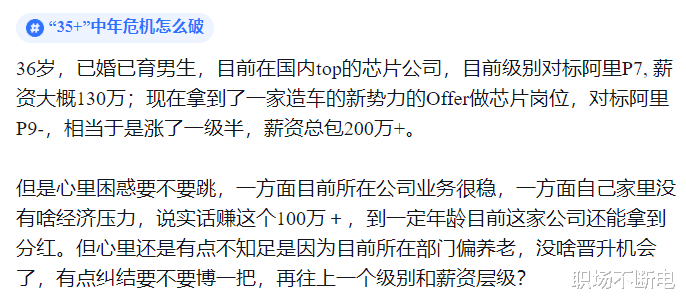 看到网上一个芯片方向的哥们案例:36岁,已婚已育,目前在国内top的芯片公司,目前级别对标阿里P7, 薪资大概130万;现在拿到了一家造车的新势力的Offer做芯片岗位,对标阿里P9-,相当于是涨了一级半,薪资总包200万+。目前岗位就已经没有任何上升空间了,在犹豫中。