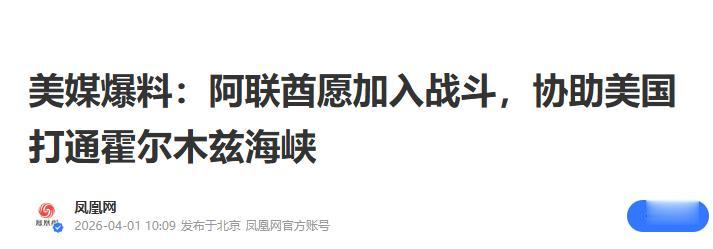 参考资料:《美媒爆料:阿联酋愿加入战斗,协助美国打通霍尔木兹海峡》凤凰网2026-04-01
