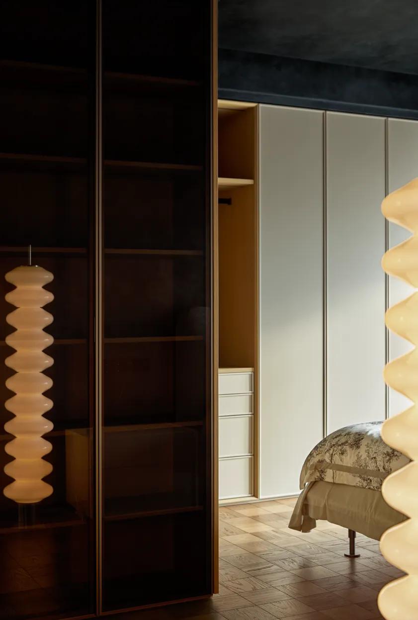 The master bedroom is designed with dark gray walls according to the preferences of the occupants, creating a calm and peaceful resting environment. The design technique of integrating walls and ceilings enhances the overall sense of space. The matching cloakroom and dressing table have improved their functional configuration.