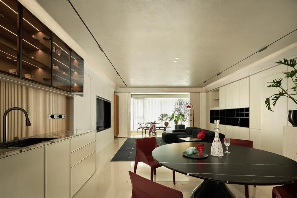 餐厨区域延续客厅的设计语言,白色橱柜与黑色圆桌保持视觉连贯性。红色餐椅延续了空间的色彩节奏,墙面装饰画为空间注入艺术气息。