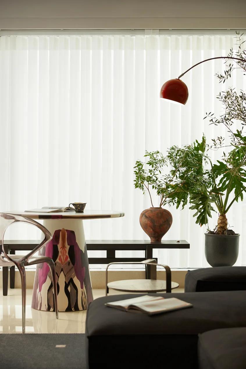 客厅内,黑色沙发与地毯同白色橱柜墙面构成鲜明对比。红色落地灯与小边几成为空间的亮色点缀,在沉稳基调中注入活力。随着季节更替,绿植的生机将为空间带来更加明媚的气息。