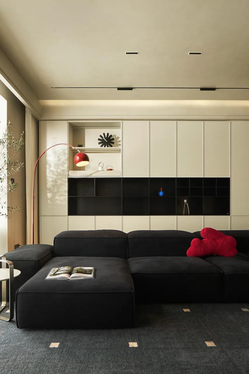 In the living room, the black sofa and carpet create a sharp contrast with the white cabinet walls. The red floor lamp and small corner become bright color accents in the space, injecting vitality into the calm tone. As the seasons change, the vitality of green plants will bring a brighter atmosphere to the space.