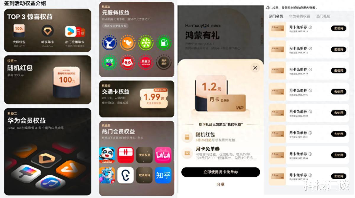 这个“游戏”的玩法很简单:升级到鸿蒙 5.1后,从桌面右滑到负一屏就能找到“鸿蒙有礼”入口。核心玩法就是“每日签到”。每天点一下,就像完成了一次日常任务,然后就能抽取每天的小惊喜,包括现金红包、热门应用的月卡免单券、华为应用的会员等等,养成的乐趣直接拉满。