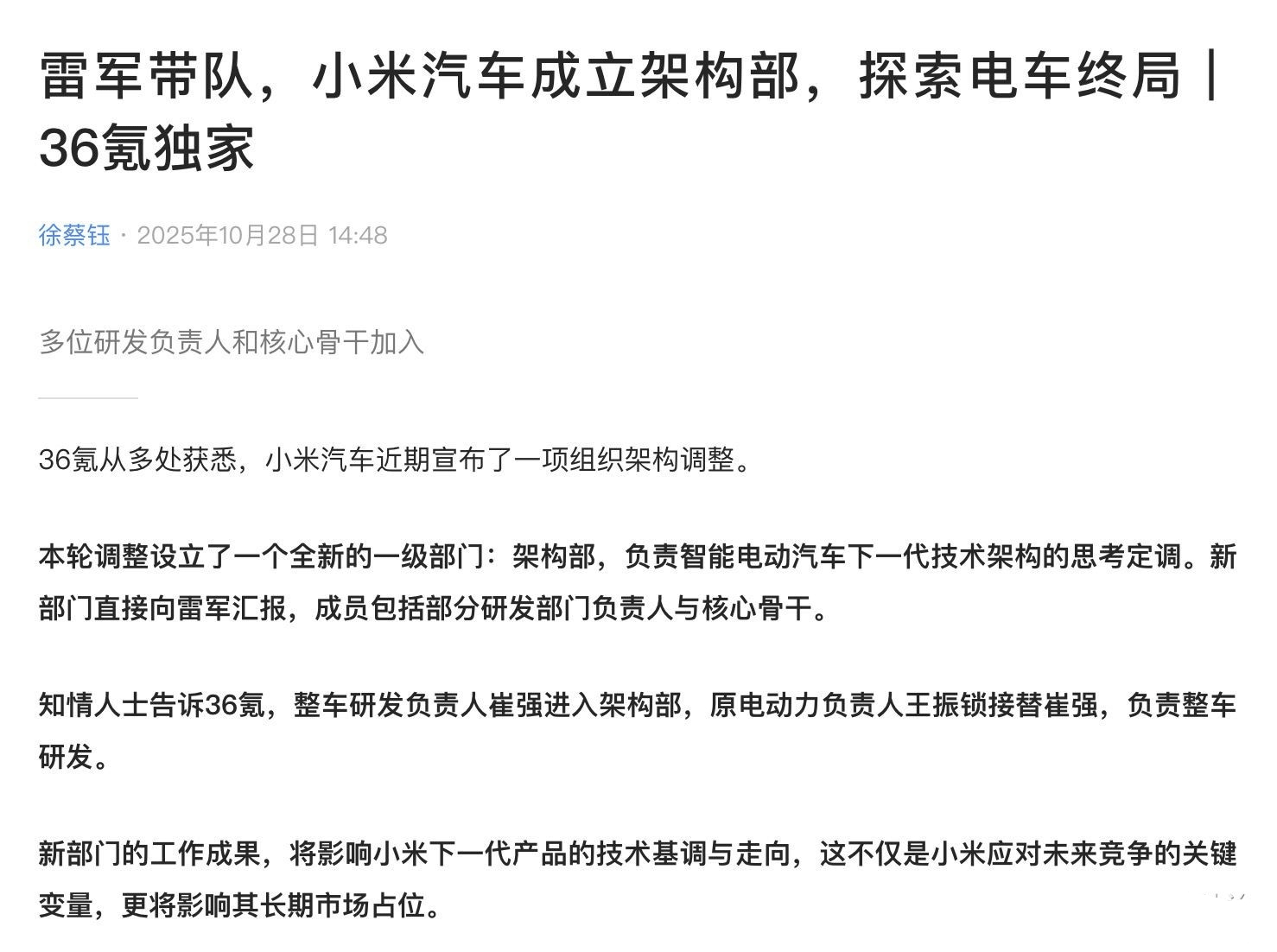 10月28日,据36氪爆料,小米汽车近期宣布了一项组织架构调整——设立全新的一级部门"架构部",负责智能电动汽车下一代技术架构的思考定调。