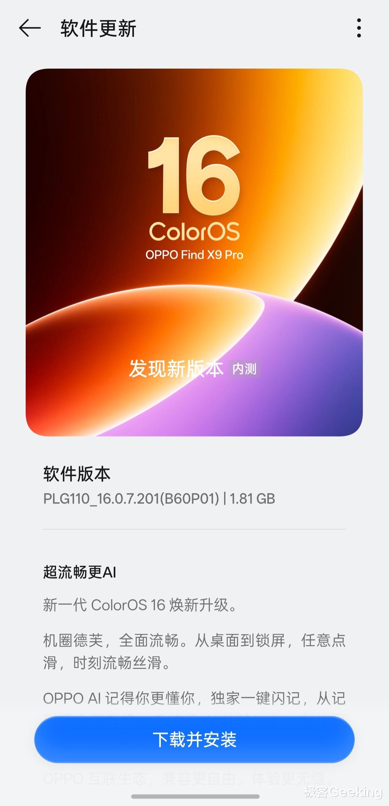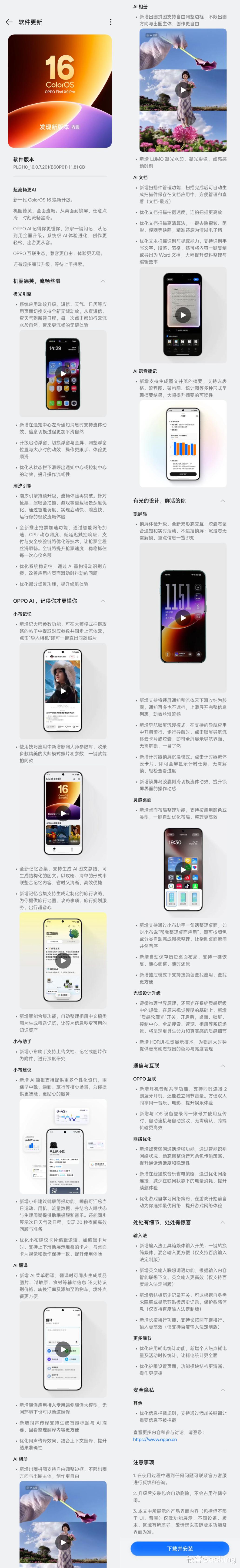比如 OPPO Find X9 Pro,最新的 ColorOS 16 内测版是 16.0.7.201,OTA 更新包体积 1.81GB。