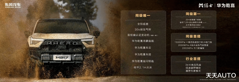 猛士M817 Hero版的到来,与在售的猛士M817 Pro版、Max版、Max+版组成更全面的智能越野产品矩阵,让猛士汽车“智野家族”实力再升级。猛士M817 Hero版以全域通达的硬核实力,让每一次远征底气十足;以华为乾崑赋能的智能科技,让每一段旅程安心从容;更以全能拓展的改装潜力,让每一个梦想的改装方案都能照进现实。